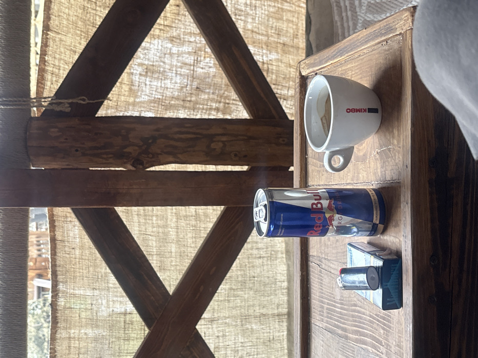 An individual's perspective is captured from a seated position overlooking a rustic wooden surface. On this surface, from left to right, rests a blue and white Marlboro cigarette pack with a silver lighter placed horizontally on top. Adjacent to the cigarettes is an opened blue and silver Red Bull energy drink can. To the right of the Red Bull can, a white ceramic coffee cup containing a dark brown liquid (coffee) is visible, with the word "KIMBO" vertically printed on its side. The background features a semi-enclosed structure comprising dark brown wooden cross-beams and a vertical post, set against a light-colored, textured fabric screen, possibly burlap. Beyond the screen, sparse greenery is discernible, indicating an outdoor setting. The bottom right corner of the image shows a partial view of a leg covered by light grey fabric. This scene is located within an outdoor or semi-outdoor seating area, consistent with a cafe, restaurant, or private balcony in Sofia, Bulgaria.