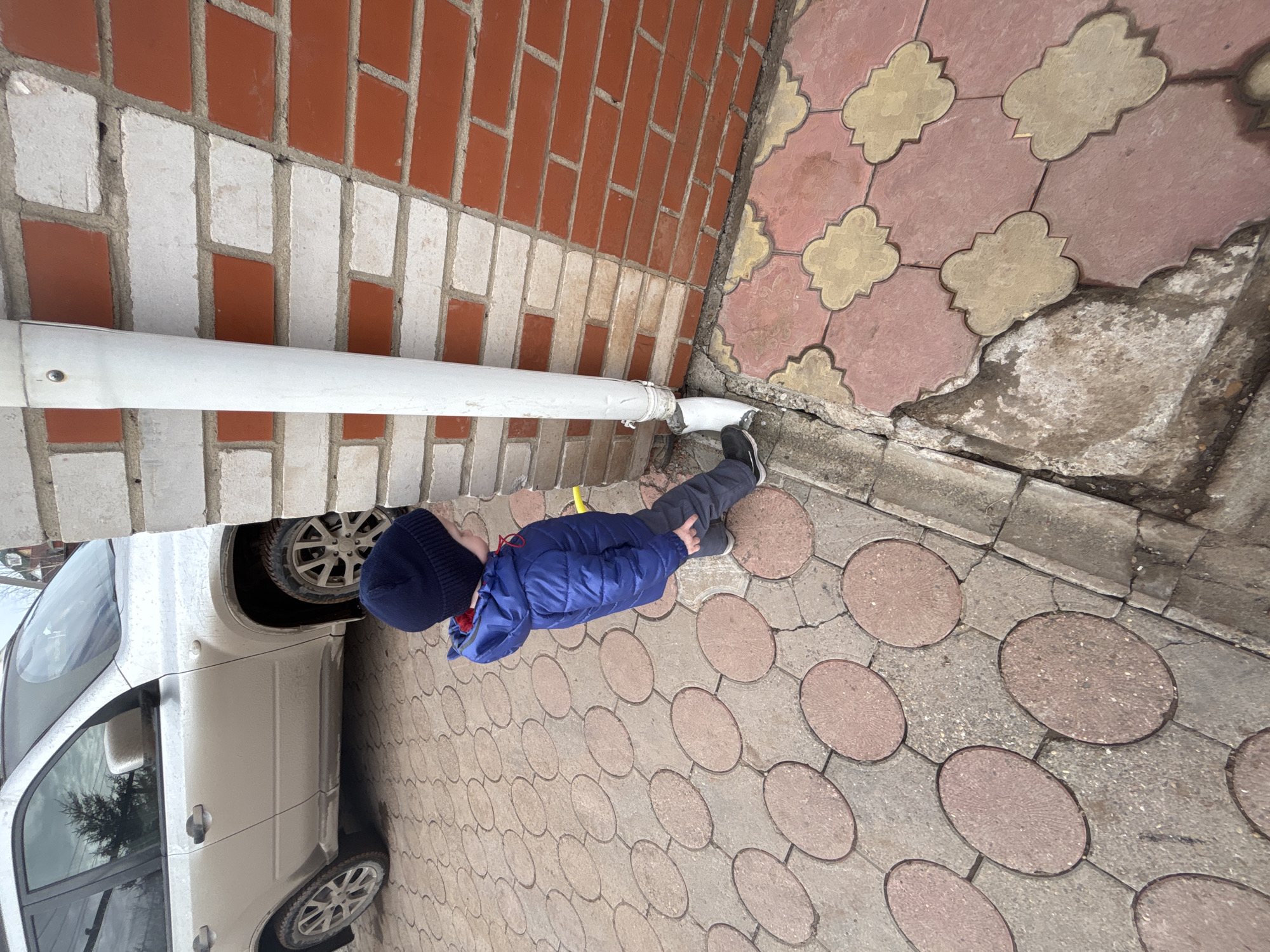 In Gamovo, Russia, a young child, dressed in a dark blue knit hat, a blue quilted jacket with a red inner lining, grey trousers, and black sneakers, stands on a paved surface. The child faces towards the right side of the frame, looking down at the base of a white PVC downspout affixed to a brick wall. The wall is constructed with a pattern of alternating red and light-colored bricks. The ground beneath the child is paved, displaying two distinct patterns: grey concrete with embedded reddish-brown oval elements to the left, and reddish-pink and beige clover-shaped tiles adjacent to the wall on the right. The lower section of the downspout is visibly broken, with damp soil or muddy water pooled around its base. In the upper left background, a dirty silver SUV is parked on the oval-patterned pavement, reflecting an overcast sky and distant trees.