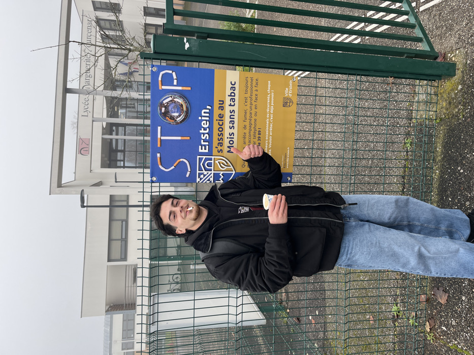 A young adult male stands outdoors in Erstein, France, in front of the Lycée Marguerite Yourcenar building. He is positioned in front of a green wire mesh fence, which serves as a barrier to the school property. The male, wearing a black bomber jacket, a dark hooded sweatshirt, light blue jeans, and a black backpack, faces the camera directly. A lit cigarette is present in his mouth, and he holds a white paper cup in his left hand. His right hand is raised, forming a thumbs-up gesture. Immediately to his right, affixed to the fence, is a blue and yellow banner. The banner prominently displays "STOP" with letters formed by cigarettes and features a graphic of cigarette butts. French text on the banner reads, "Erstein, s'associe au Mois sans tabac" (Erstein, partners with the Tobacco-Free Month), followed by information about professional support for quitting smoking and the crest of the "Ville d'Erstein" (City of Erstein). The background shows the modern, light-colored facade of the Lycée Marguerite Yourcenar under an overcast sky.