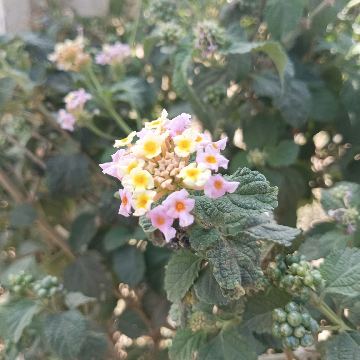 A close-up image captured in Barakin Sabawa, Nigeria, presents a cluster of multi-colored flowers and associated plant structures. The central floral arrangement consists of numerous small florets, with their petals transitioning from pale yellow in the interior to light pink at the outer edges, each containing a bright yellow center. These flowers are attached to a stem surrounded by dark green, textured leaves exhibiting visible venation. To the lower right, a cluster of spherical, green, berry-like structures or unripe fruit is discernible. The background is rendered out-of-focus, displaying blurred green foliage and circular bokeh effects, consistent with natural outdoor lighting and a shallow depth of field. No individuals or man-made objects are present in the scene.