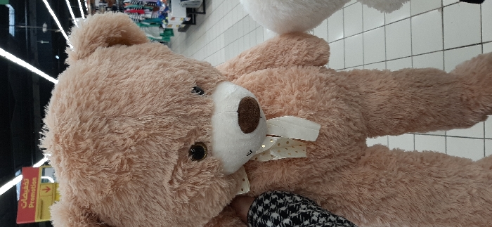 This image depicts the interior of a large retail hypermarket in Meknes, Morocco. The primary subject is a large, light brown, fluffy plush teddy bear, viewed from the chest level down to its upper legs. The teddy bear features dark, spherical, reflective eyes, a white snout, and a dark brown, oval-shaped nose. A cream-colored ribbon with gold polka dots is tied in a bow around its neck. A black and white patterned garment, likely a person's clothing, is partially visible on the left side, suggesting someone is holding or carrying the teddy bear. A portion of another white, fluffy plush object is visible on the right side. The environment features a light-colored tiled floor with dark grout lines forming a grid pattern. The ceiling is dark, with multiple linear fluorescent light fixtures illuminating the scene. In the background, shelving units are visible, displaying various folded and hung clothing items in an array of colors. A prominent red and yellow sign in the upper left background displays the Arabic word "تخفيضات" (Takhfidat, meaning discounts or sales) above the English word "Promotion," accompanied by a downward arrow. This type of large retail store, indicated by the signage and merchandise, is consistent with a hypermarket chain like Marjane or Carrefour in Meknes.