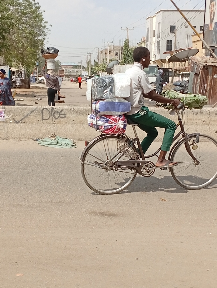 - "A male individual rides a dark-framed bicycle from right to left on an asphalt road in Sabon Gari East, Nigeria" by FM-TtYM52, licensed under CC BY 4.0