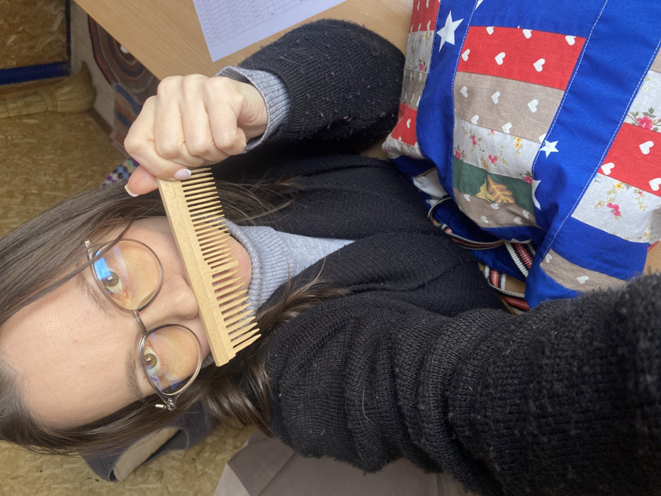 An individual with long brown hair and light-framed glasses is depicted in an indoor setting in Ol'khovskoye, Russia. The person is wearing a gray turtleneck sweater and a dark, pilled cardigan, and is looking directly at the viewer. A light-colored wooden comb, which has some broken teeth, is held horizontally across the individual's upper lip. A multi-colored patchwork quilt, featuring blue sections with white stars, red sections with white hearts, and other patterned fabric squares, is visible in the lower right foreground, resting on a wooden surface. A white sheet of paper with visible data is also on the wooden surface to the right. The background consists of a wall made of oriented strand board (OSB) or plywood, with blurred, indistinct objects and patterns.