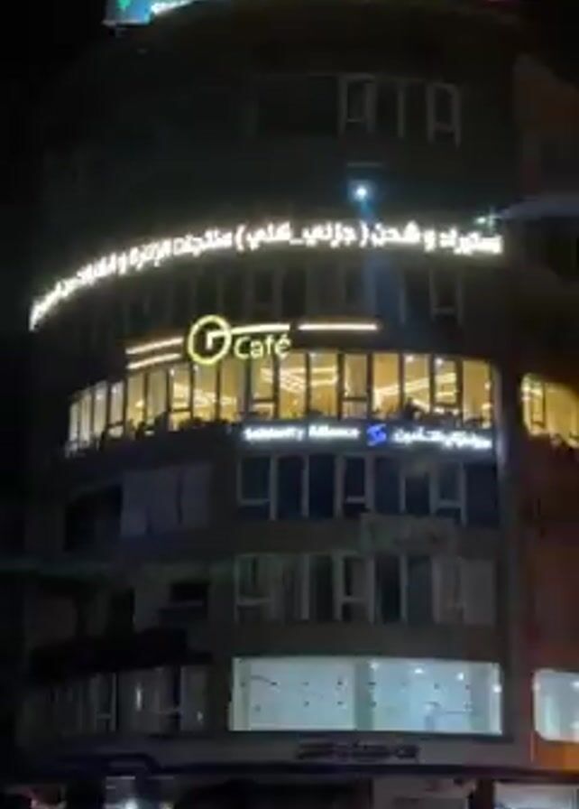 n urban street scene at night, starting with a close-up of a cafe sign. The camera then pans to reveal a street intersection with multiple buildings, illuminated signs, and moving vehicles including cars and motorbikes. A full moon is visible in the sky.