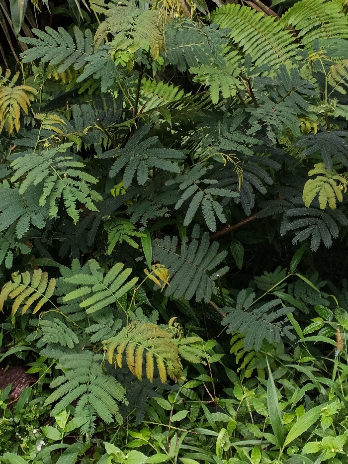 - "A dense patch of sensitive plant (Mimosa pudica) fills the frame, showcasing its pinnately compound leaves in various shades of green and yellow" by FM-TYZ8z1, licensed under CC BY 4.0