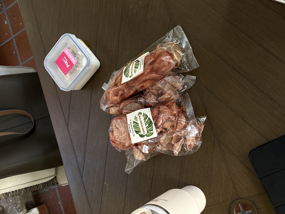 A table displays a lunchbox with a pink label and two plastic bags of chips with green labels. Beside them are a water bottle and a black tablet. A sofa is visible on the side. The table has a wooden pattern. The chips are reddish-brown.