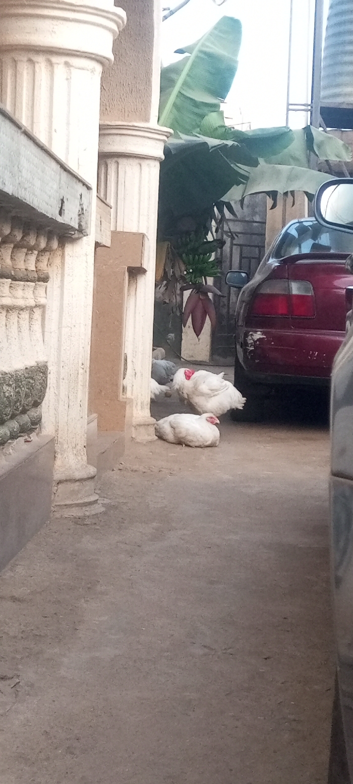 Several white chickens are clustered on a dirt surface near a building with ornamental columns and trim. A banana plant rises behind them, showing a large purple bloom. A maroon car is parked near the chickens, partially obscuring the view of a gated area. The overall scene appears to be a yard or driveway, possibly in a residential setting.