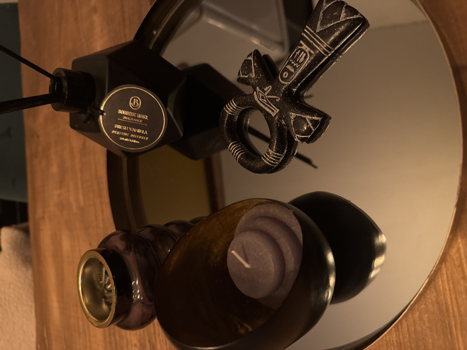 A round mirror reflects several objects. A black perfume diffuser with the label "Boutique Hotel Fragrance Fresh Vanilla" and reeds sits near an ancient Egyptian Ankh symbol. A brown candle holder containing a purple candle and a decorative black egg-shaped object are also reflected on the mirrored surface. The mirror's frame appears to be made of wood.
