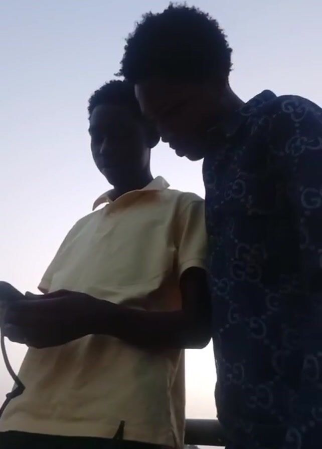 Two silhouetted young men stand outside, looking at a mobile phone. The person on the left is wearing a light yellow short-sleeved polo shirt and black pants. The person on the right is wearing a dark blue long-sleeved shirt with a Gucci print. The sky is light in the background.