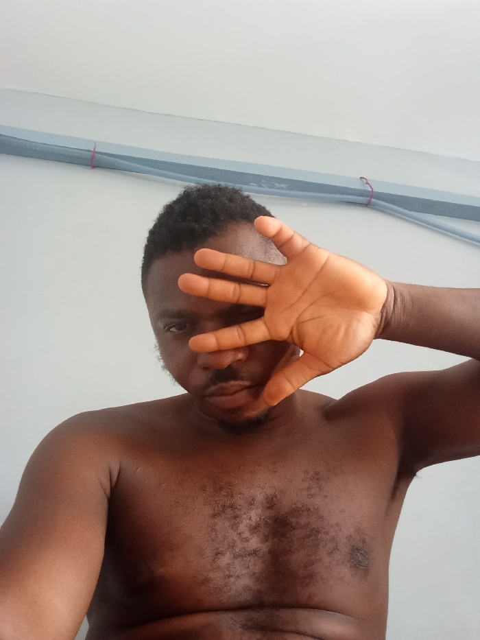 The image captures a dark-skinned adult male positioned indoors against a plain, light-colored wall in Lokoja, Nigeria. The subject is shirtless, displaying a hairy chest. His right hand is raised, partially covering his face, specifically obscuring his eyes and forehead, while his gaze is directed towards the camera. He has short, dark, curly hair and facial hair. In the upper background, two parallel blue-gray pipes or conduits are visible, affixed horizontally to the wall and secured with a thin red tie. The lighting is uniform, indicative of an indoor setting.