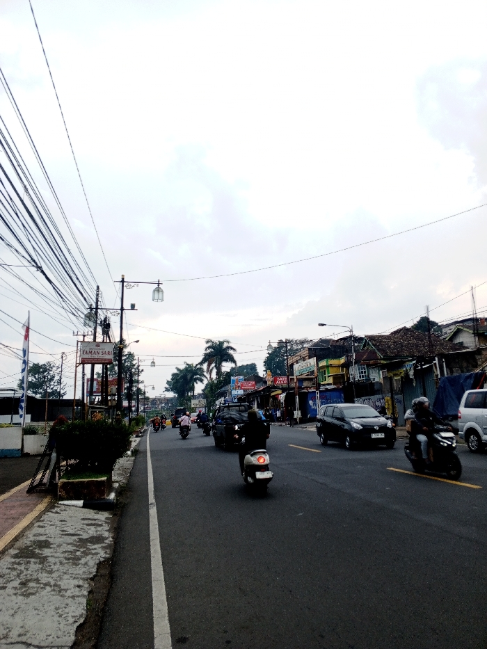 The image presents an active street in Kheda, India, viewed from a low angle under a cloudy sky. The asphalt road occupies the central and lower portions of the frame, marked by a continuous white line on the left and dashed white lines for lanes. A dense network of black utility wires dominates the upper left, stemming from a utility pole adorned with two decorative streetlights. On the immediate left, a concrete sidewalk abuts a raised planter with green foliage and a white concrete barrier. A street sign displaying 'TAMAN SARI' is mounted on a utility pole. The right side of the street features a continuous stretch of commercial and residential buildings with varied facades, some with exposed brick or painted walls, and tiled roofs. Signs like 'CATE ALBA' are visible on these structures. Palm trees emerge above the buildings further down the street. Vehicular traffic is visible, primarily consisting of motorcycles and scooters traveling away from the camera. A light-colored scooter with a single rider is centrally located in the foreground, and another dark scooter with a helmeted rider is on the far right. Other vehicles include a black minivan and a white SUV in the right lanes. Individuals are observable on the right sidewalk adjacent to the buildings.