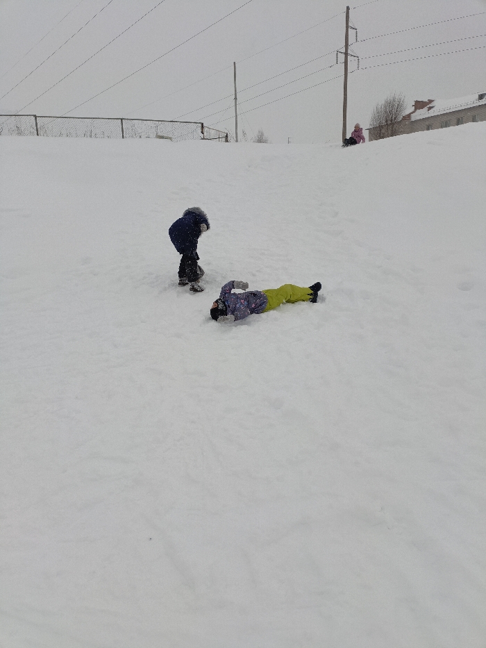 The image depicts a snow-covered outdoor scene in Sarapul, Russia, under an overcast sky. The ground is entirely covered by white snow, forming a gentle slope that rises towards the background. In the lower-midground, two children are visible. One child, dressed in a dark blue winter coat with a fur-lined hood and dark pants, is bent forward, facing away from the camera. To their immediate right, a second child, wearing a patterned purple winter jacket and bright yellow-green snow pants, is lying supine (on their back) in the snow with arms bent at the elbows and legs extended. Further up the snowy slope, in the upper right background, a third child wearing a pink winter jacket and hat is seated. The background includes several utility poles supporting multiple power lines that traverse the sky. A fence runs along the crest of the snow-covered rise. A building with a reddish roof and light-colored walls is partially visible in the far upper right portion of the image, adjacent to some sparse, bare vegetation.