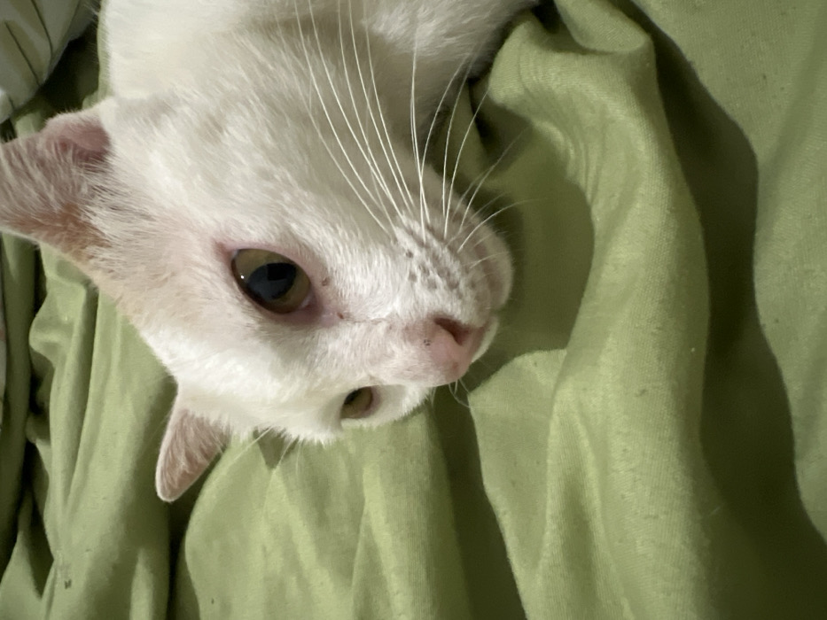 - "A white cat with light tan markings on its right ear and forehead is depicted lying on a wrinkled, light green fabric surface" by FM-gZMgt2, licensed under CC BY 4.0
