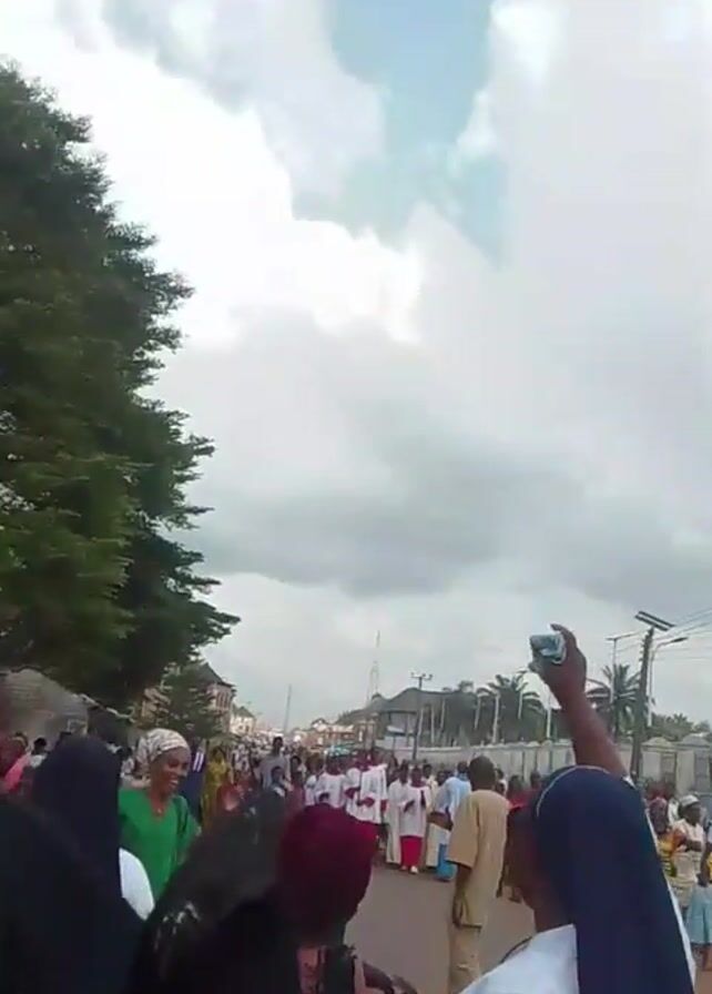 The video depicts a large group of people, some dressed as nuns, participating in what appears to be a procession or march on a street lined with houses and trees