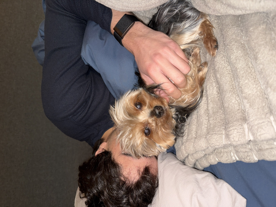- "A man lies in bed with a Yorkie dog nestled against his face" by FM-jYf6s2, licensed under CC BY 4.0