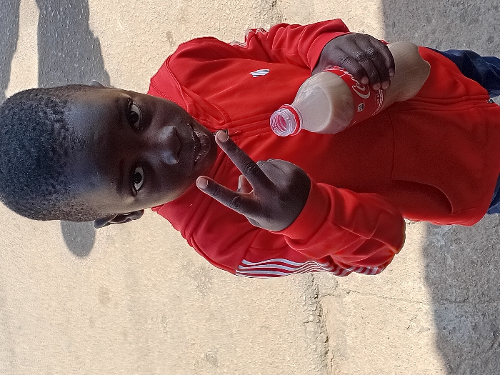 A young male child, estimated to be between 5 and 7 years old, is depicted from an elevated perspective, standing on a light-colored, textured ground surface. He is dressed in a red zippered hooded sweatshirt featuring three white stripes on the upper left sleeve and dark-colored trousers. His left hand is raised, with the index and middle fingers extended to form a 'V' gesture. In his right hand, he holds a clear plastic Coca-Cola bottle containing a light brown, opaque liquid, with the red cap appearing partially open or absent. The child looks directly at the camera with a neutral expression. Shadows are visible on the ground behind him, indicative of strong overhead lighting. This scene is located in Jos, Nigeria.