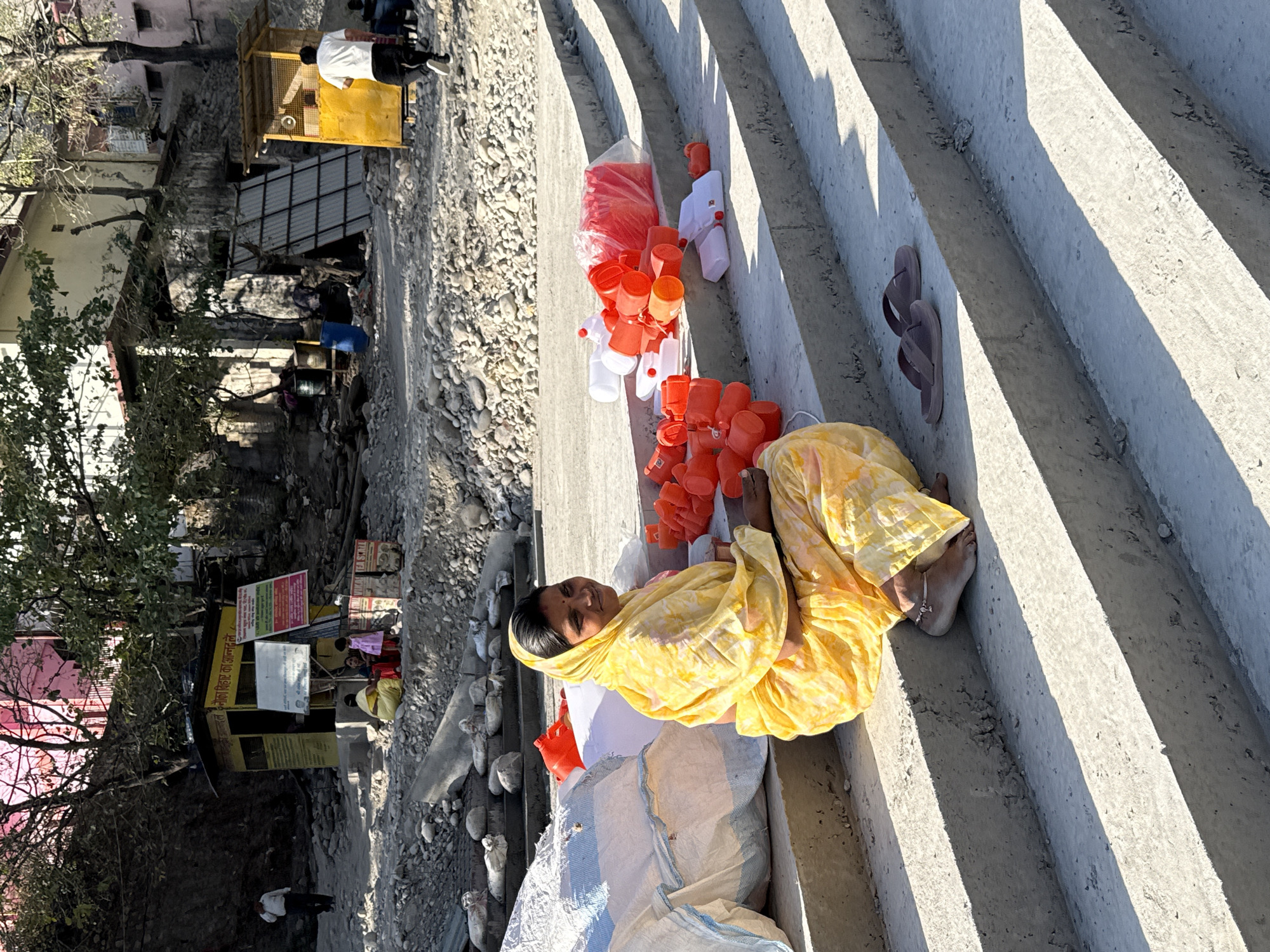 A woman sits on a concrete staircase next to a collection of orange plastic cups. The staircase runs along the shore near a building with signage, a tree, and other shops nearby. A person in a white shirt stands behind a yellow structure in the background. The location is Rishikesh, India.