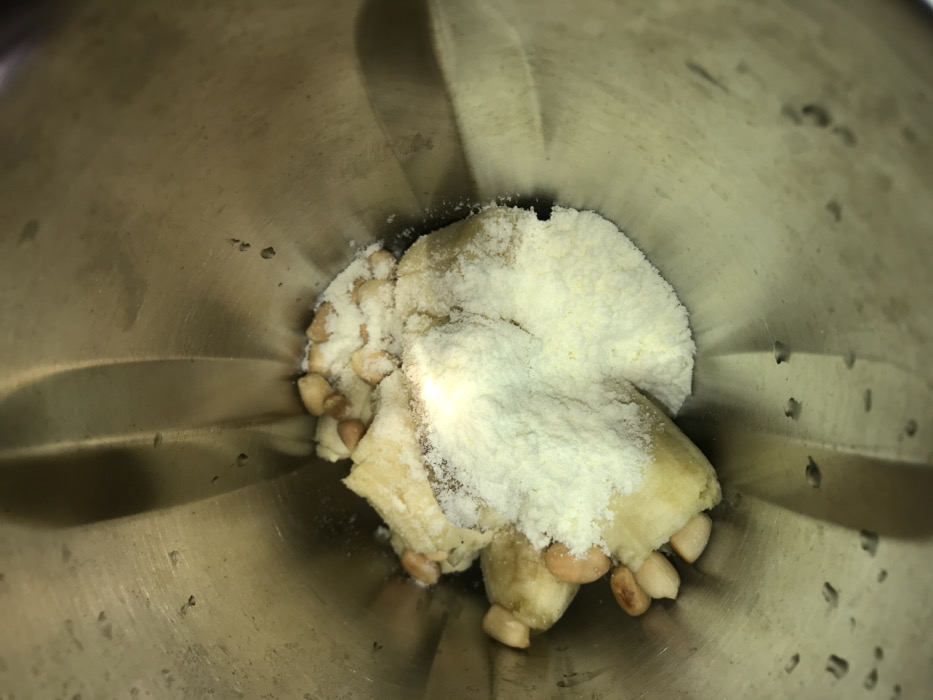 Inside a metallic blender or food processor cup in Galadimawa, Nigeria, several chunks of peeled banana are visible, mixed with numerous light brown, shelled peanuts. A substantial amount of white, finely ground powder, consistent with powdered milk or sugar, is piled over the bananas and peanuts. The metal interior of the cup shows minor scuffs and specks. The ingredients are static, prepared for processing.