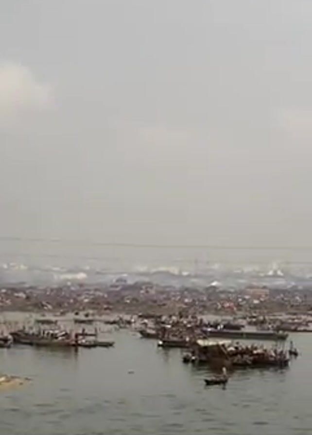 wide view of a body of water, possibly a lake or bay, densely populated with small boats. The boats appear to be clustered together near what seems to be a densely built settlement extending into the water. The settlement consists of structures that appear to be makeshift and crowded. The air is hazy, potentially indicating pollution or fog, which obscures the background and the city skyline further in the distance.