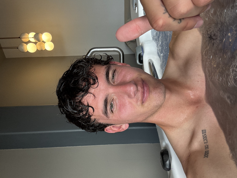 A man's wet face and upper torso are visible. He has dark curly hair, fair skin, and a faint tattoo on his chest. He appears to be in a bathroom, with a wall on the left and a white tub or sink to his right. Above him, there's a modern light fixture with multiple round bulbs. His right hand is raised near his face, with his index finger pointing slightly up.
