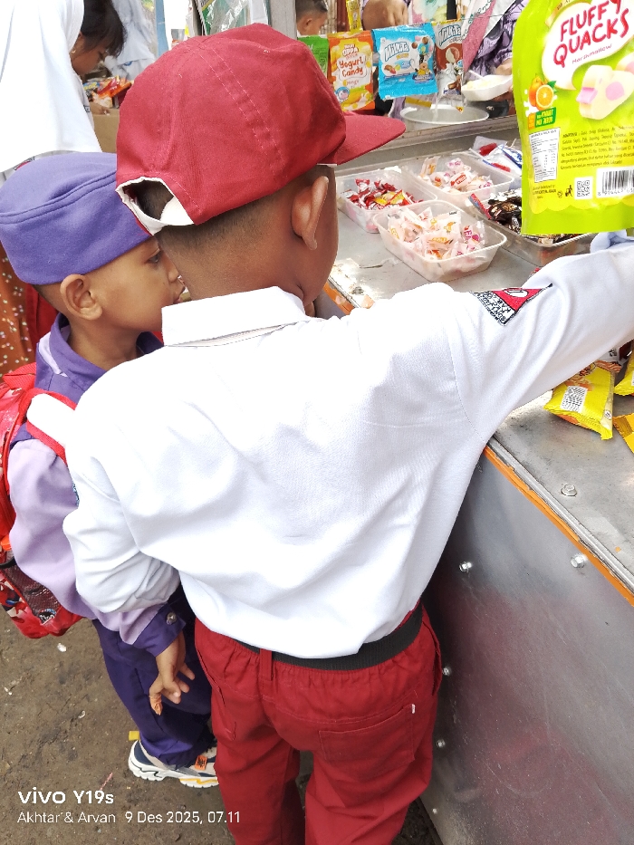 Two young children in school uniforms are standing at a snack cart. The child in the foreground wears a red cap, white shirt with a school emblem on the sleeve, and red pants. A second child in a purple cap and matching uniform stands beside them. The cart is filled with snacks like candies, yogurt treats, and a package of Fluffy Quacks marshmallows. The image is labeled with "vivo Y19s," "Akhtar & Arvan," and the date "9 Des 2025, 07.11" indicating the photograph was taken with a vivo Y19s phone.