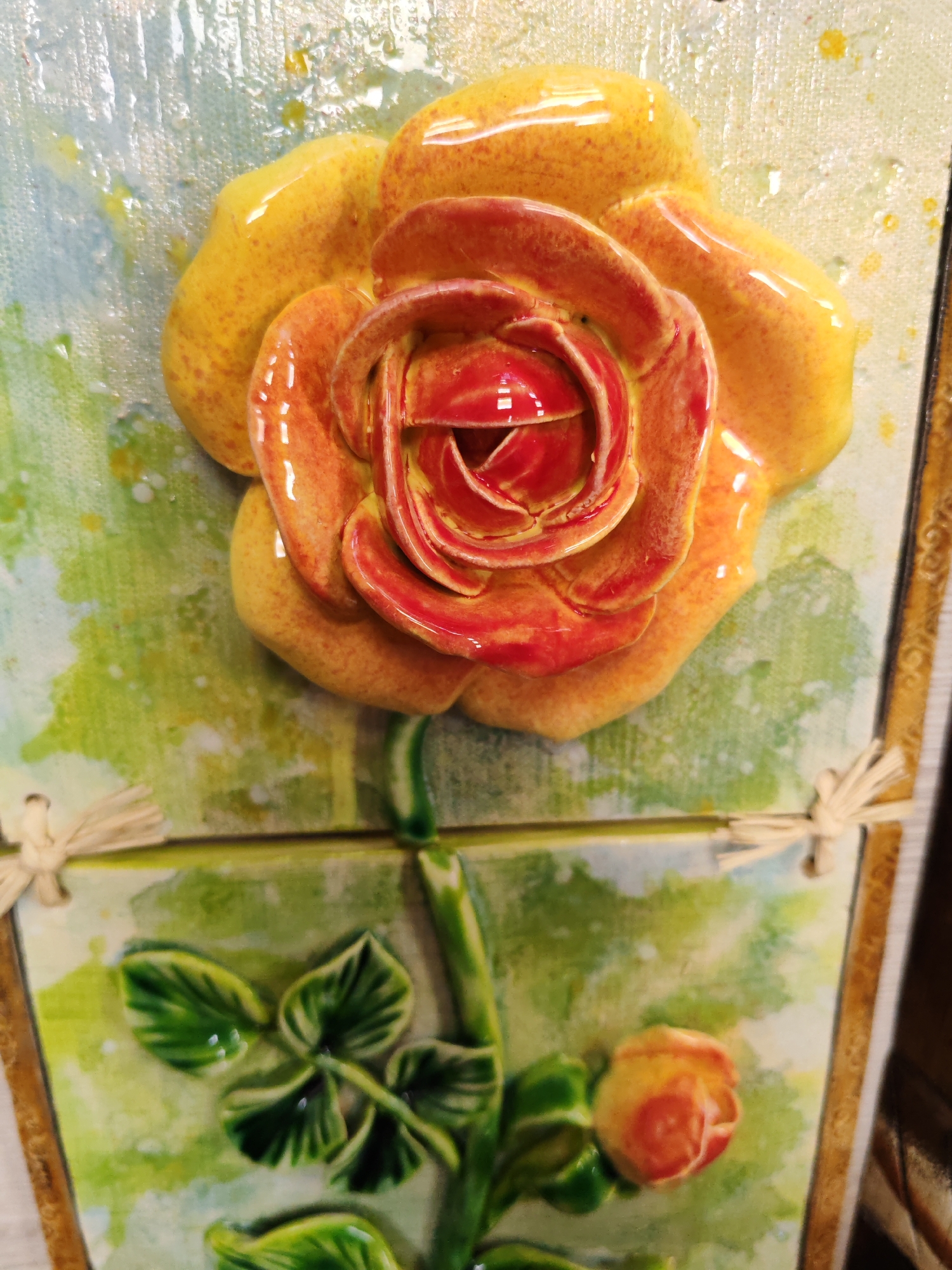 ceramic artwork featuring a large, stylized rose. The rose is predominantly yellow with red accents on the petal edges and center. It is three-dimensional, protruding from a background painted with green, blue, and white hues. A green stem extends from the rose downward, accompanied by green leaves. A smaller bud is also present at the bottom of the stem. The artwork is framed with a textured, brownish border and features straw-like ties on either side. The overall style suggests a handmade or craft-oriented piece. There is no evidence to support the location of this image being in the city of Vidin, Bulgaria.