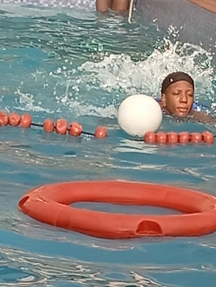 A person swims in a pool, wearing a black swim cap and blue swim goggles. They are near a lane divider with orange buoys and a white ball. An orange life preserver floats in the foreground. The water is clear blue with visible splashes and ripples. Part of the pool's edge is visible in the top of the image.