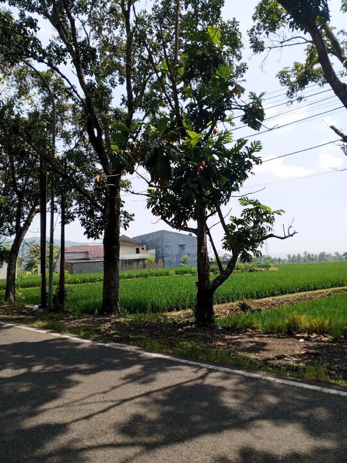 The image displays a semi-rural landscape, reportedly located in Multhan, India, under bright daylight conditions. In the foreground, an asphalt road with a partial white demarcation line along its right edge is largely obscured by prominent shadows cast by nearby trees. The midground features a line of tall, leafy trees situated to the left of the road, one of which exhibits distinct large, lobed leaves and visible fruit. Beyond these trees and a narrow strip of sparse vegetation, an expansive green agricultural field, consistent with rice paddies, extends towards the background, traversed by a thin, brown path or shallow channel. In the background, two structures are discernible: a single-story building with a reddish-brown tiled roof and light-colored walls, adjacent to a multi-story, grey concrete building with a flat roof. Distant hills or mountains are faintly visible on the horizon. The sky is mostly clear blue with scattered white cumulus clouds, and multiple electrical power lines are strung across the upper portion of the frame. No human figures, animals, or active interactions are present in the scene.