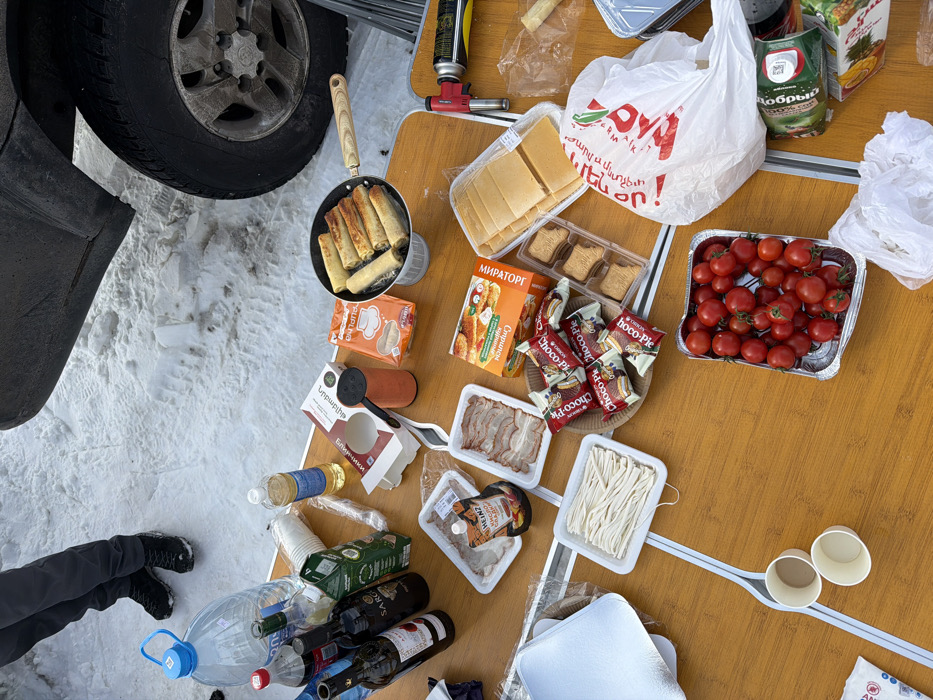 The scene depicts an outdoor cooking and picnic setup in Tsovazard, Armenia, on a snow-covered ground