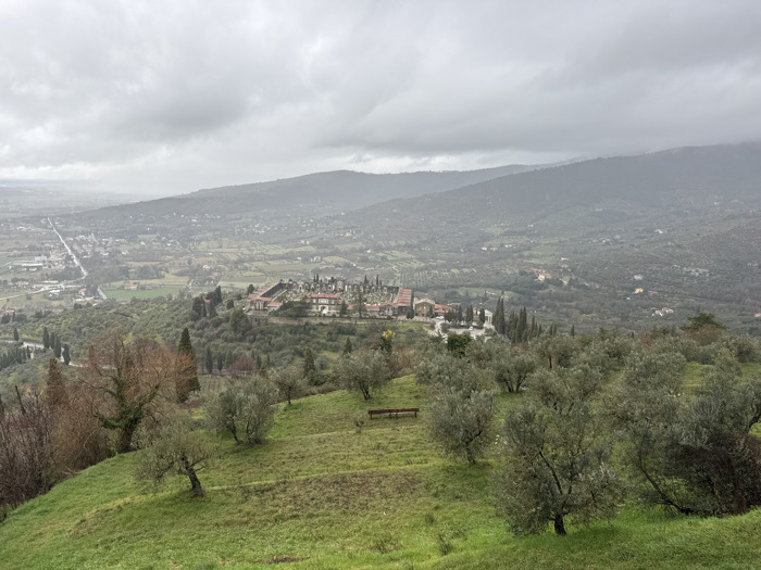 - "This image presents a panoramic, wide-angle view from an elevated position in Cortona, Italy, looking down into a valley under an overcast, uniformly gray sky" by FM-IdNfF2, licensed under CC BY 4.0