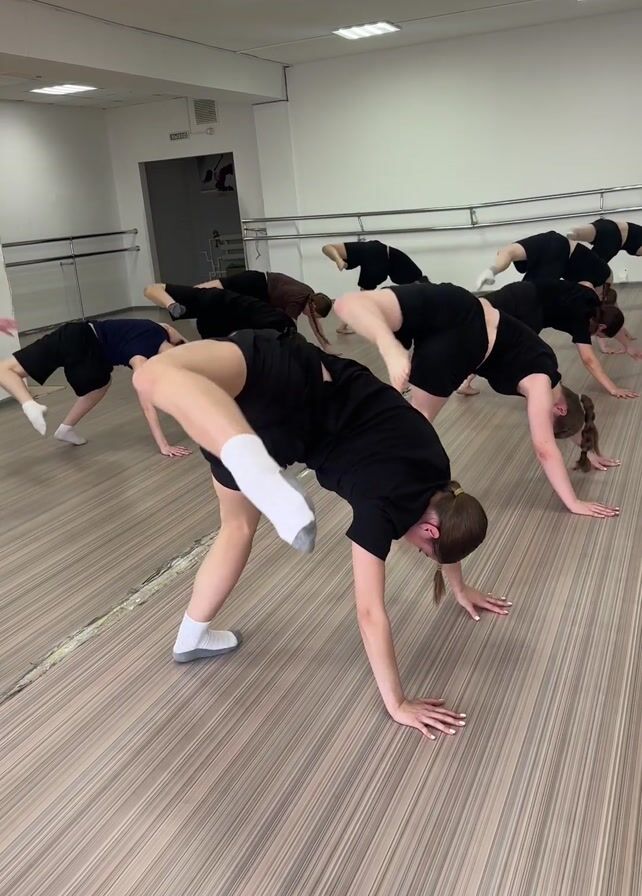 In a well-lit dance studio, a group of approximately nine young women are practicing a dance routine. They are wearing comfortable clothing, mostly black shorts and tops, with some wearing socks. The studio has a wood-patterned floor, white walls, and fluorescent ceiling lights. There is a door with a sign in the background. The dancers start in a position with their hands on the floor and one leg extended up and back, then transition into a seated position with one leg extended to the side. They appear focused and coordinated as they move through the sequence.