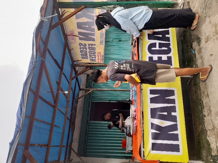 Two customers stand before a roadside stall, one in a hijab and the other in a t-shirt and shorts. The stall has a blue tarp roof and sells fish, indicated by an "IKAN" sign. A second sign above reads "IKAN SEGAR FROZEN". Two individuals operate inside the stall behind a counter. The area appears to be an informal market or street food vendor setup.