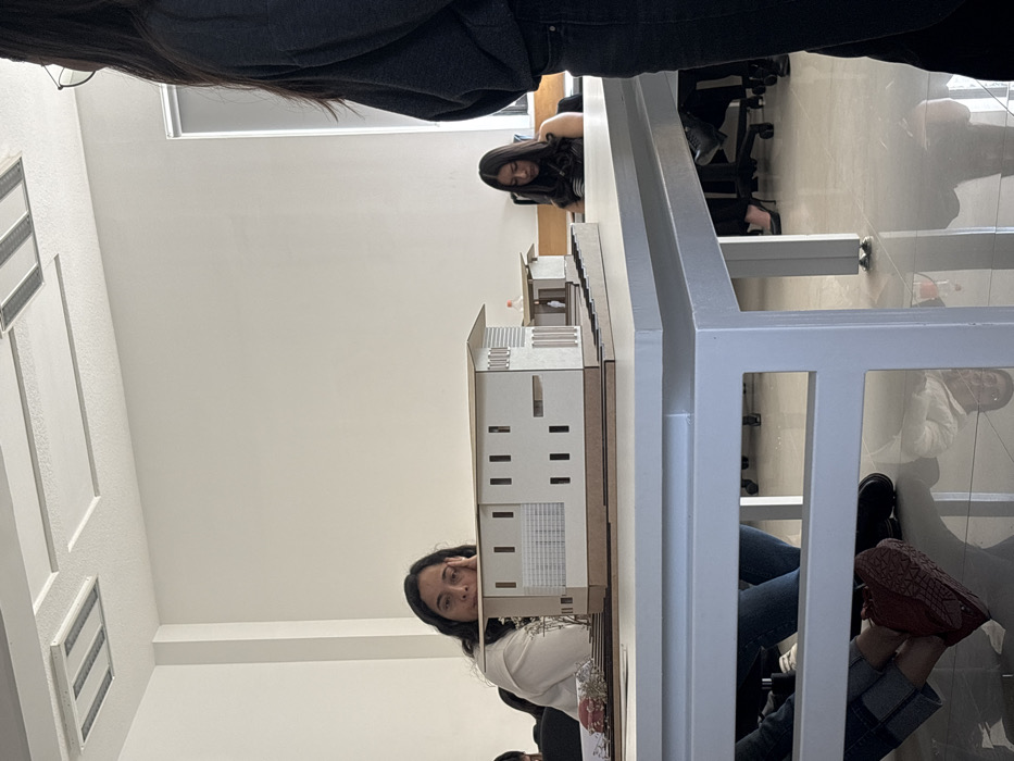 The photo shows an architectural model on a white table, viewed from a low angle. Two women sit at the table, one partially obscured by the model and the other is further away, seemingly resting. The room appears to be a studio or classroom with white walls and overhead lighting. Another person is seen sitting on the opposite side of the table. The photograph's composition focuses on the model and the immediate surroundings.