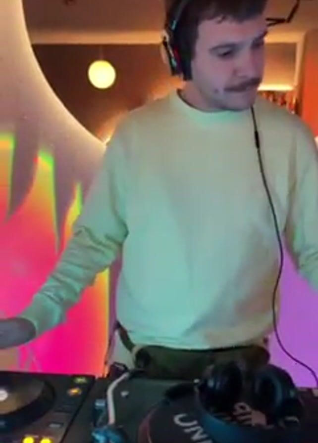 A DJ in a pale yellow long sleeve shirt and headphones stands behind a DJ setup, looking down and manipulating the equipment. He has a mustache and a fanny pack around his waist. The background is a trendy bar with colorful lighting, particularly pink and green. There is a white, undulating decorative structure behind him. Other people can be seen blurred in the background, suggesting a public space like a bar or club.