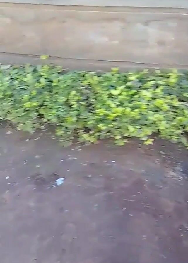 n outdoor area, possibly a schoolyard or courtyard, with a narrow dirt path alongside a low wall. A line of low-lying green plants runs along the base of the wall. At the end of the path, a group of people, likely students, are gathered, some seated at tables. The lighting suggests it may be a slightly overcast day. There is trash on the ground. The camera moves slowly along the path.