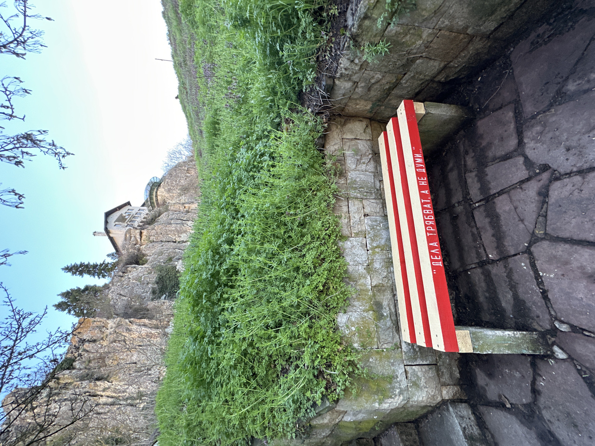 The photograph depicts a stone structure, possibly a wall or ledge, covered in lush green vegetation. Adjacent to the greenery is a striped red and white wooden beam with Cyrillic text written vertically in red, appearing to say "дела трябват, а не думи". Below the beam, a stone surface leads into what appears to be a dimly lit entryway. In the background, a rocky cliff face is visible, with a building perched atop it. Deciduous trees with bare branches are present in the lower left, suggesting a season with less foliage. The sky is a pale blue, indicating daylight. Based on the Cyrillic text, this image is likely from a region using the Cyrillic alphabet. The phrase is a quote from Vasil Levski, a Bulgarian revolutionary, suggesting the photograph was taken in Bulgaria. The location is likely Pleven, Bulgaria, a city known for its historical connections to Levski.