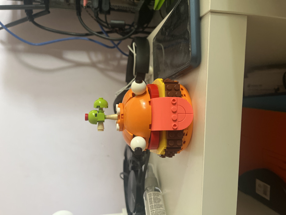 A Lego burger character rests on a white shelf. The burger's bun is orange, with white eyes and brown burger fillings. A green and red Lego contraption protrudes from the side. Behind the character are electronics, wires, a black phone, and a white wall. A speaker and cleaning spray are visible at the bottom. Part of another shelf is on the right.