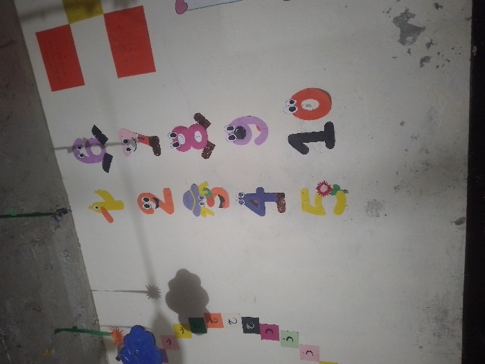 The location is not discernible from the image, but the scene appears to be an indoor setting, likely an educational or child-oriented space. The image depicts a light-colored wall, exhibiting extensive dirt, grime, and peeling paint, particularly towards the bottom. The ceiling, visible at the top of the frame, appears to be rough concrete or unfinished. Several decorative elements are affixed to the wall and suspended from the ceiling by green strings. On the left side of the wall, a blue cloud-shaped cutout and a grey cloud-shaped cutout hang suspended. Below the blue cloud, a vertical arrangement of small, square cutouts displays Arabic letters (ت, ج, ح, خ, د, ذ) in various colors. Two vertical columns of colorful, cartoonish number cutouts are prominently displayed on the wall. The left column, from top to bottom, features a yellow duck cutout (representing 1), an orange '2' with eyes, an orange '3' adorned with a blue hat and eyes, a purple glitter-accented '4', and a yellow '5' accompanied by a pink flower. The right column, from top to bottom, includes a purple '6' with wings and eyes, a pink '7' with legs and eyes, a pink '8' with eyes and legs, a purple '9' with eyes, and a black '10' where the '0' is red and has eyes. On the upper right portion of the wall, two red rectangular cutouts and one yellow rectangular cutout are visible. No individuals are present in the scene.