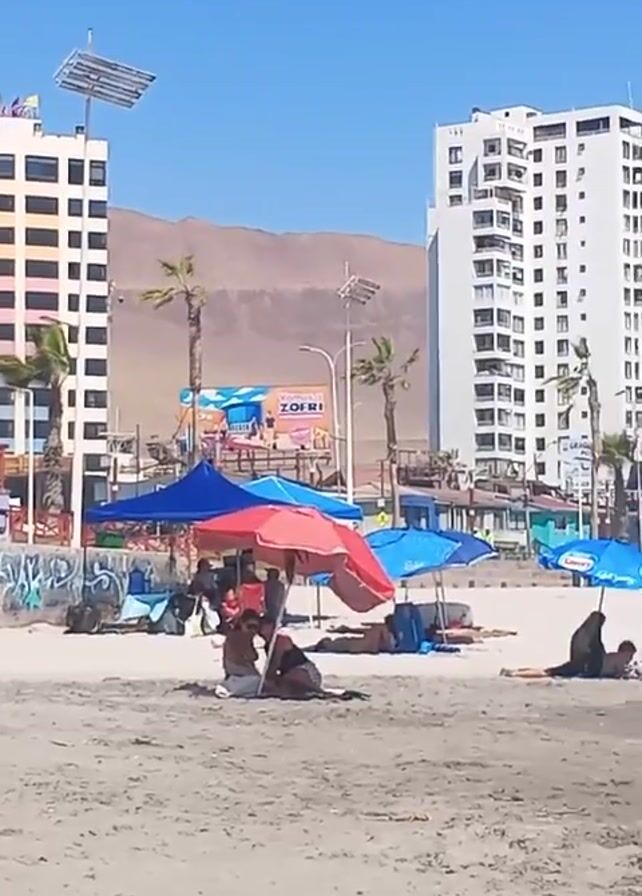 beach scene with several high-rise buildings in the background. The buildings are a mix of light and dark colors. Behind the buildings, there are mountains in the distance. The sky is clear and blue. The beach is sandy and populated with people. Some people are sitting under colorful beach umbrellas. There are also people walking along the beach. The water appears to be calm. A billboard for a “ZOFR” advertisement is present in the background.