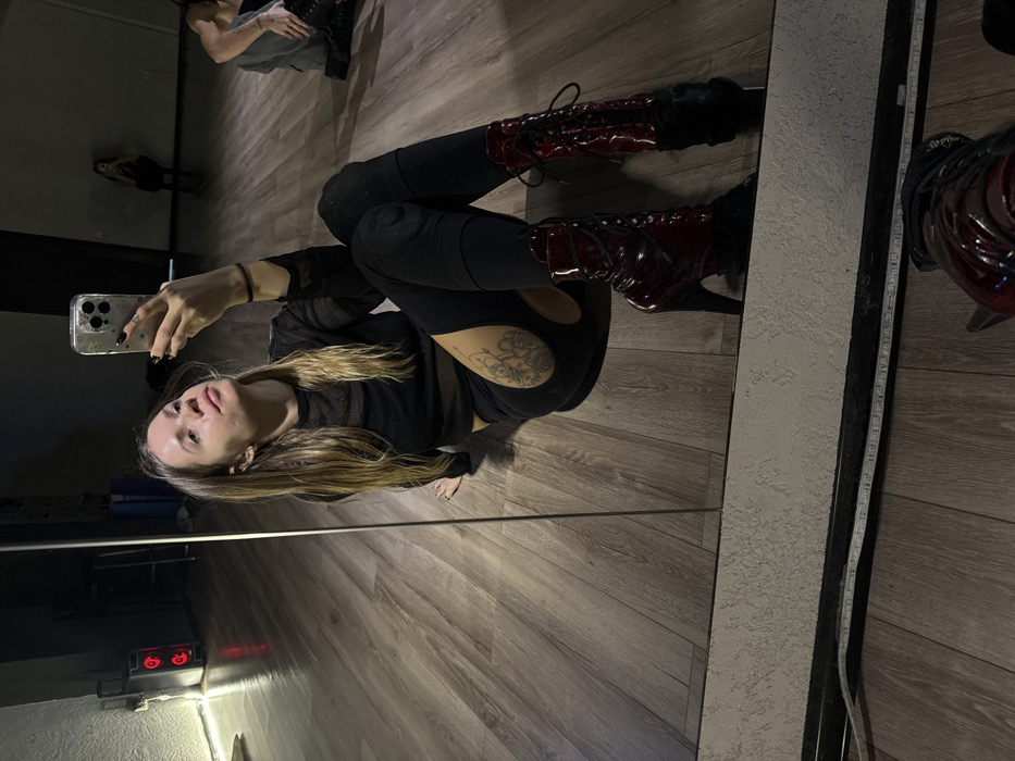 An indoor studio in Batumi, Georgia, is depicted, featuring a large mirror against which a woman is seated on a light wooden floor. The woman, with light brown hair, is wearing a black mesh crop top, black leggings with a large cutout on her left thigh revealing a floral tattoo, and dark red, patent leather, high-heeled lace-up boots. Black fabric, possibly leg warmers or boot covers, partially obscures the boots. She holds a silver-cased smartphone in her left hand, extended upwards, capturing her reflection in a mirror selfie. Her right hand rests on the floor. Her gaze is directed upwards and to the left of the phone. In the reflection of the studio, a strip of white lighting is visible along the base of a dark wall to the far left, above which a dark object with red illuminated elements is present. Further in the background reflection, a dark figure stands or sits, and another individual is partially visible in a crouched or seated position, wearing grey pants and dark boots, with their back partially to the mirror.