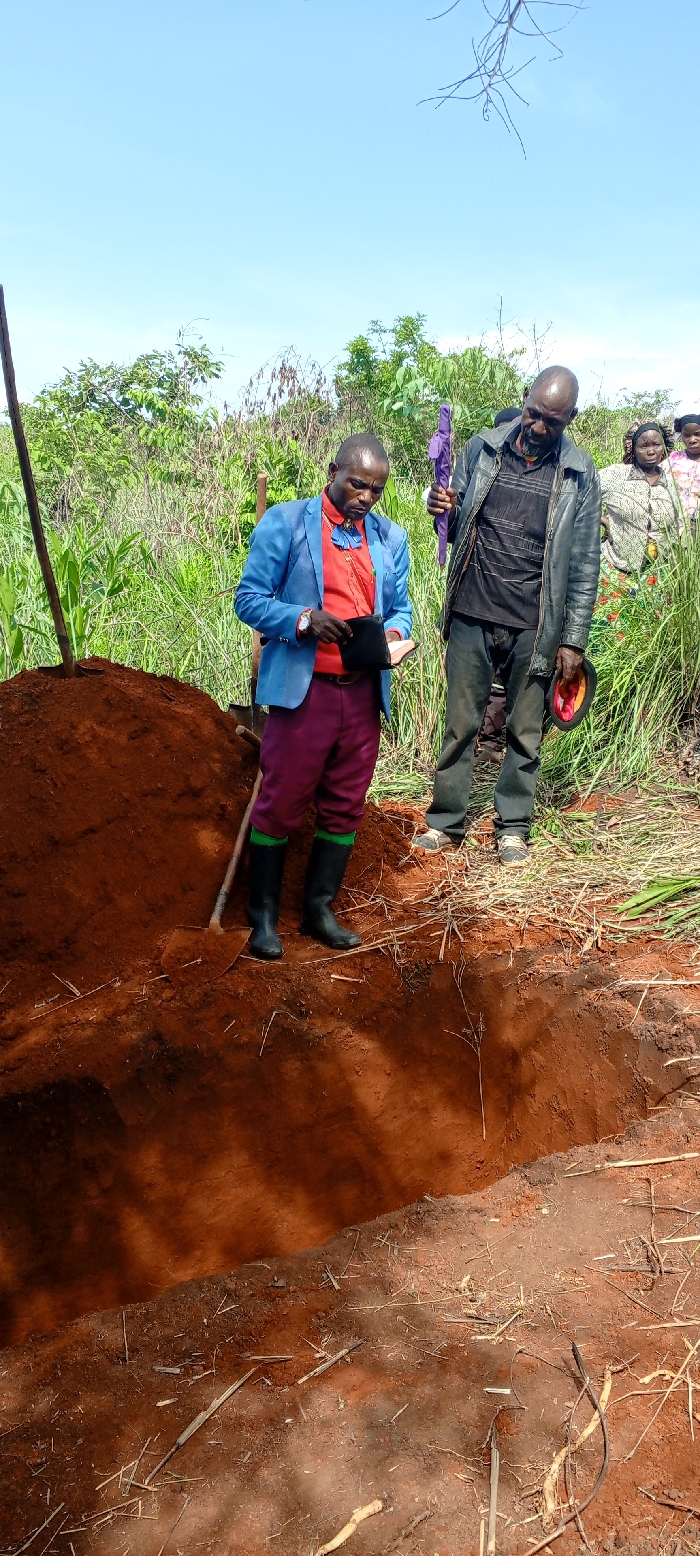 The image captures an outdoor scene in a rural or semi-rural area, specified as within or near Namisha, Democratic Republic of the Congo. The focal point is a freshly excavated, rectangular pit in reddish-brown earth, indicative of a grave, with a large mound of soil adjacent to its left edge. Two adult males are prominent. The male on the left, dressed in a bright blue blazer over a red shirt with an ornate collar, maroon trousers, and black rubber boots with green upper bands, stands next to the soil mound. He holds a small, dark object, possibly a book or wallet, in both hands, looking down at it intently. A spade or shovel leans vertically against the soil mound near his feet. To his right, a second male, wearing a dark leather jacket over a dark striped shirt and dark trousers, stands with his head bowed, also looking downwards. He holds a folded purple fabric object, possibly an umbrella, in his left hand, and a dark-brimmed hat with an orange underside, held inverted, in his right hand. In the background, dense green vegetation, including tall grasses, shrubs, and trees, defines the horizon under a clear blue sky. Two additional individuals, appearing to be adult females, are partially visible to the far right, obscured by vegetation and the second male. The scene is brightly illuminated by direct sunlight, casting shadows on the ground and within the pit.