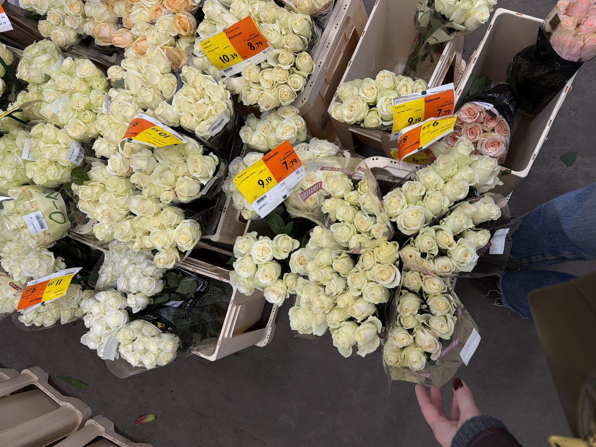 The image provides an overhead view of a retail flower display within an establishment in Rīga, Latvia