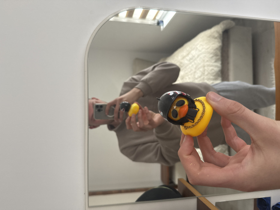 The scene depicts a direct view of a left human hand holding a customized yellow rubber duck, reflected in a mirror within an indoor setting in Varna, Bulgaria