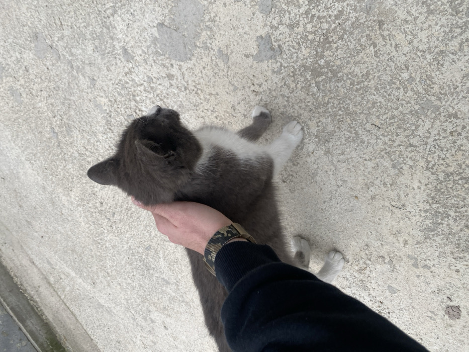 - "In the city of Kozarsko, Bulgaria, a human's right hand is observed petting a domestic cat on an outdoor concrete surface" by FM-cbvpN2, licensed under CC BY 4.0