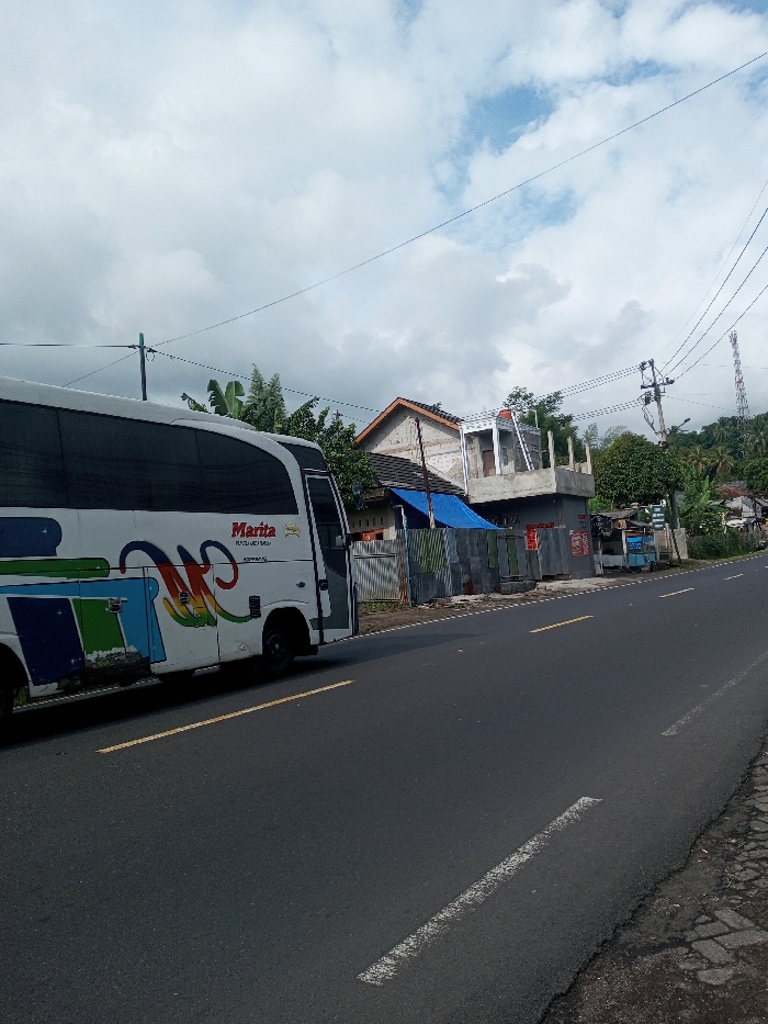 A white bus with colorful designs is parked on a paved road next to residential buildings. The bus has tinted windows and the name "Marita" written on it. Behind the bus, there are houses with metal fences and a blue tarp covering part of one structure. Power lines stretch across the sky, with trees and a telecommunications tower visible in the background. The sky is overcast with a mix of white and gray clouds.