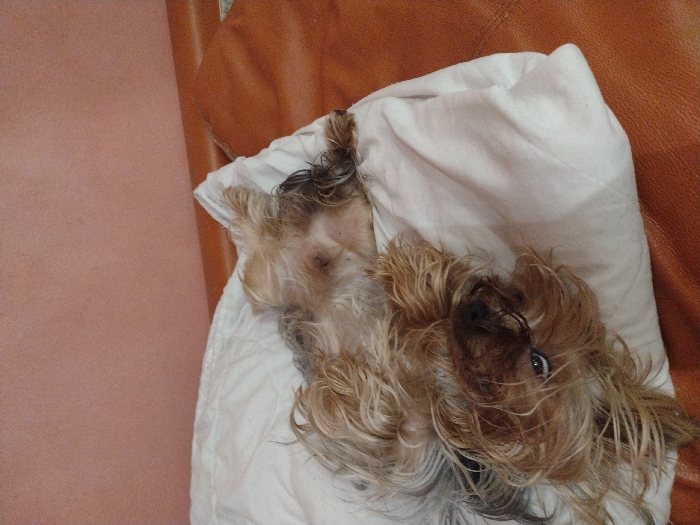 - "A small, long-haired canine, consistent with a Yorkshire Terrier or similar breed, is depicted lying on its back, exposing its light-colored belly" by FM-kk8k83, licensed under CC BY 4.0