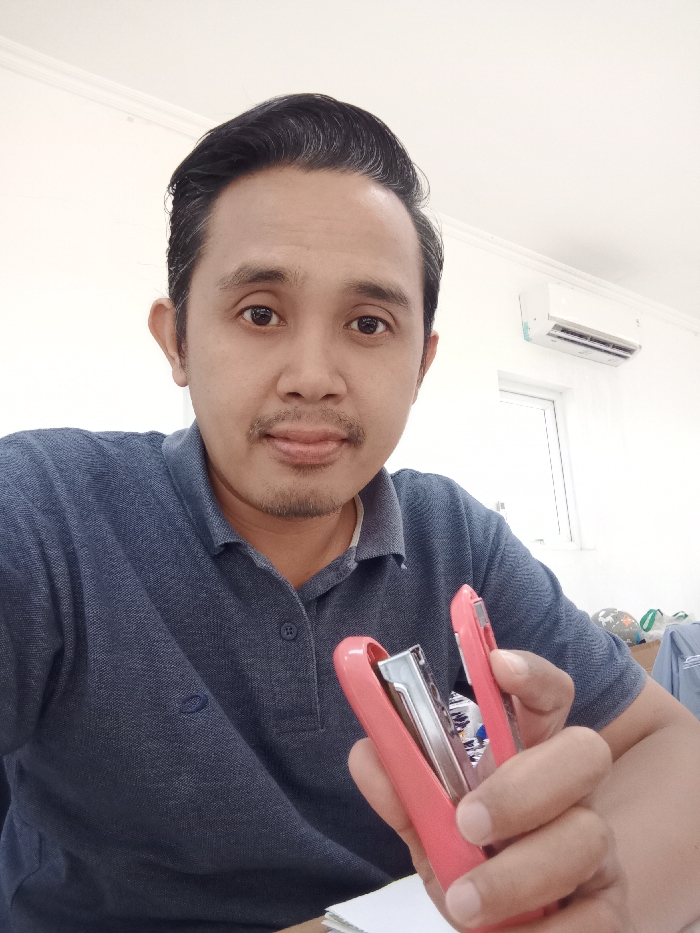 A man holds an open, pink stapler. He faces the camera with a slight smile. He has dark hair styled back and is wearing a blue-gray polo shirt. The background is a bright, well-lit room with a window and an air conditioner. Some papers and items are visible on the desk in the lower part of the frame. The lighting is bright.