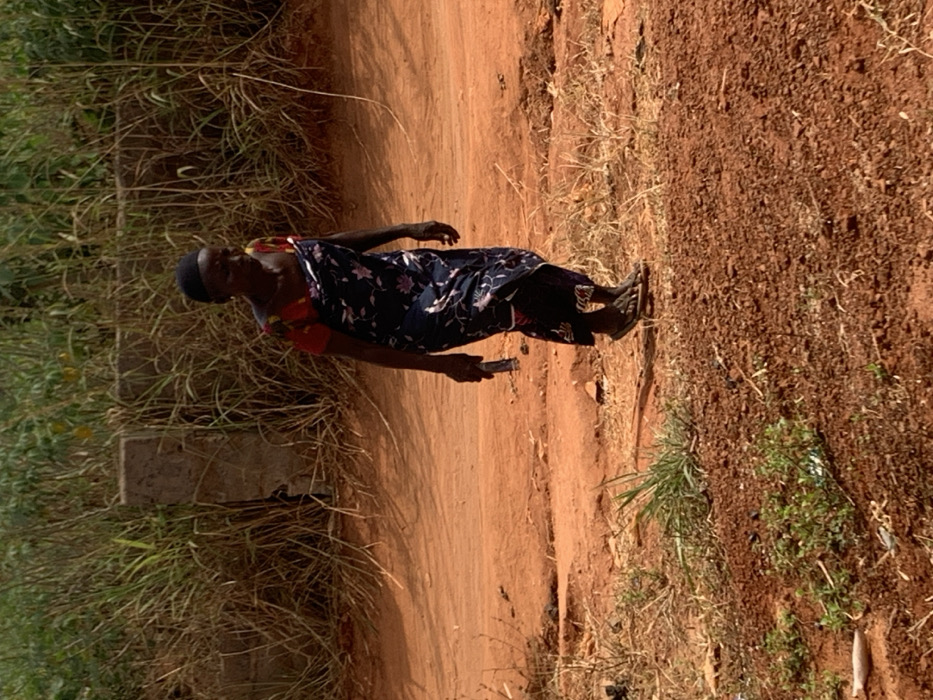 An adult individual walks from left to right across a reddish-brown dirt path in Aguleri, Nigeria, under clear daylight conditions