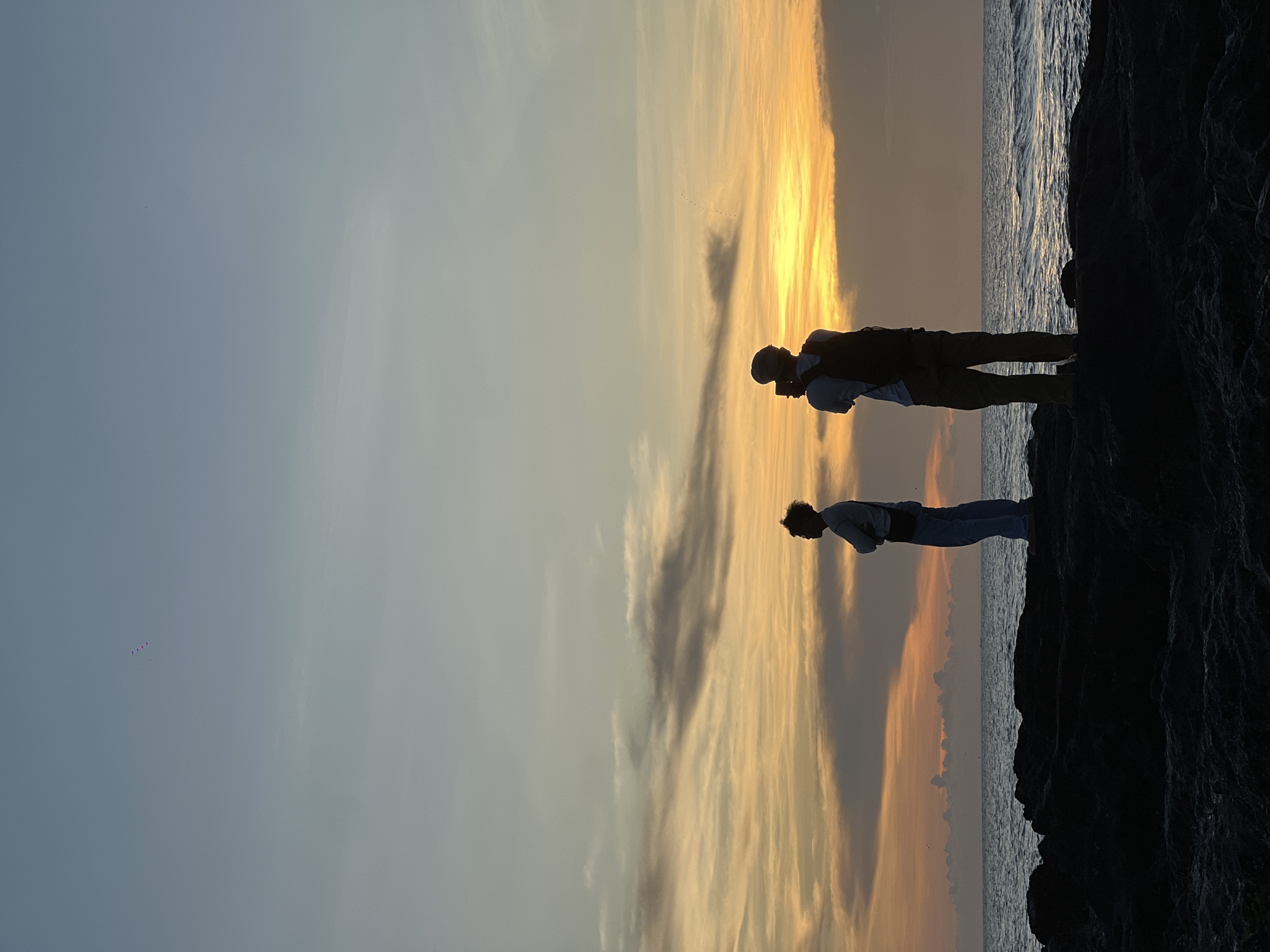 Two people are standing on a dark, rocky outcropping next to a body of water, likely the ocean