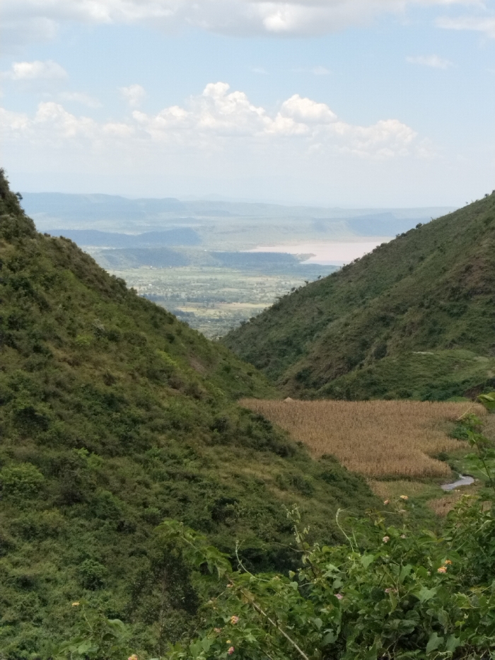 The image presents an elevated, panoramic view of a valley and distant landscape within Subukia ward, Kenya, under a partly cloudy sky. The foreground is dominated by two steep, green hillsides covered in dense scrub and foliage, framing a central downward slope. In the midground, between these hillsides, a rectangular field of dry, light-brown crops, likely maize, is visible. A narrow, winding dirt path or dry riverbed is discernable on the right side of this field, leading towards the valley floor. A small, light-colored structure is faintly visible at the far end of the cultivated field, nestled against the left hillside. Beyond the immediate valley, a broader expanse of green, undulating terrain with scattered settlements and agricultural patches extends. In the distant background, a large, reddish-brown body of water, possibly a lake or reservoir, is prominently featured, bordered by hazy blue-grey mountain ranges or escarpments on the horizon. The sky is light blue with scattered white cumulus clouds. No individuals, animals, or active interactions are present.